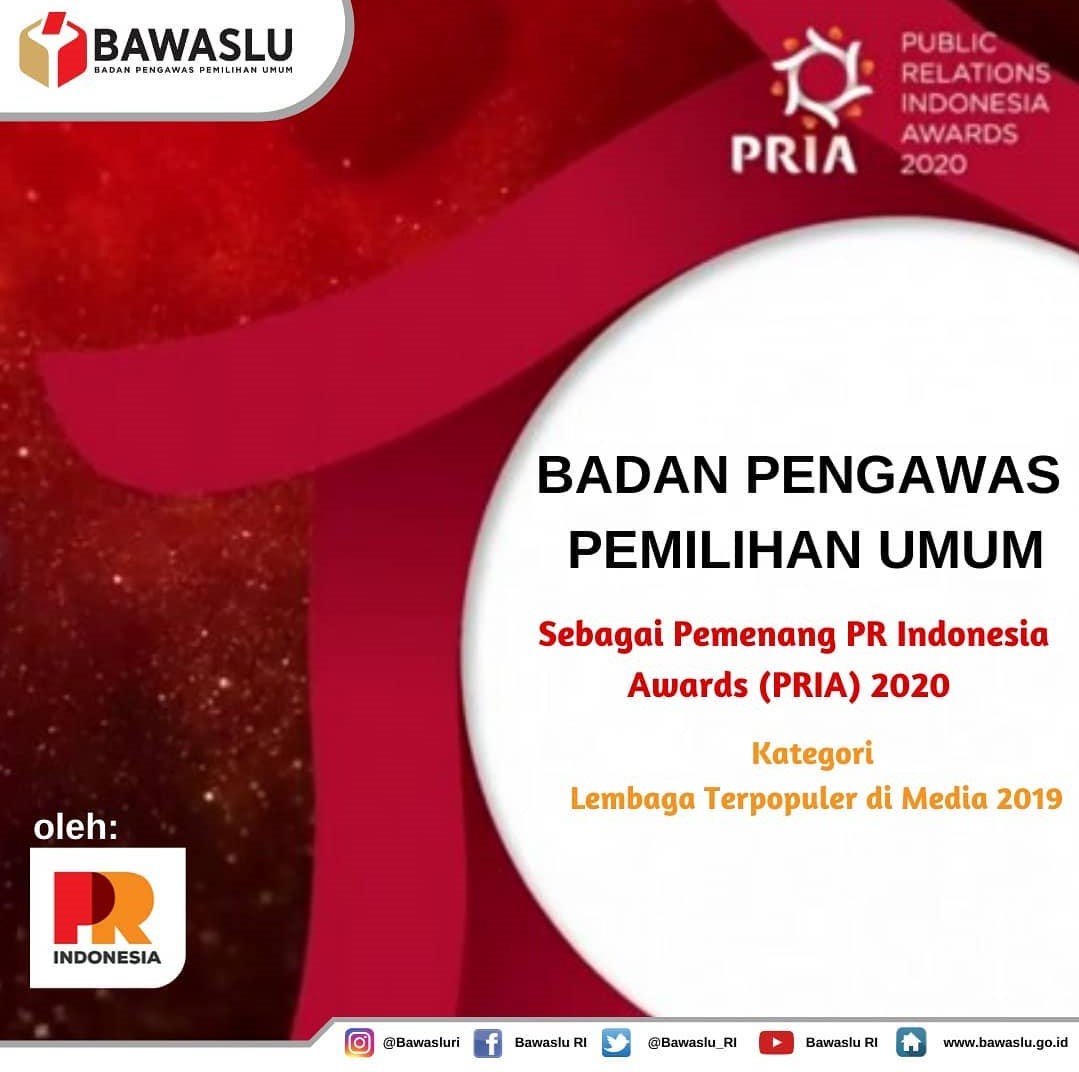 Bawaslu RI Raih Lembaga Terpopuler di media dalam Ajang PR Indonesia Award (PRIA) 2020.