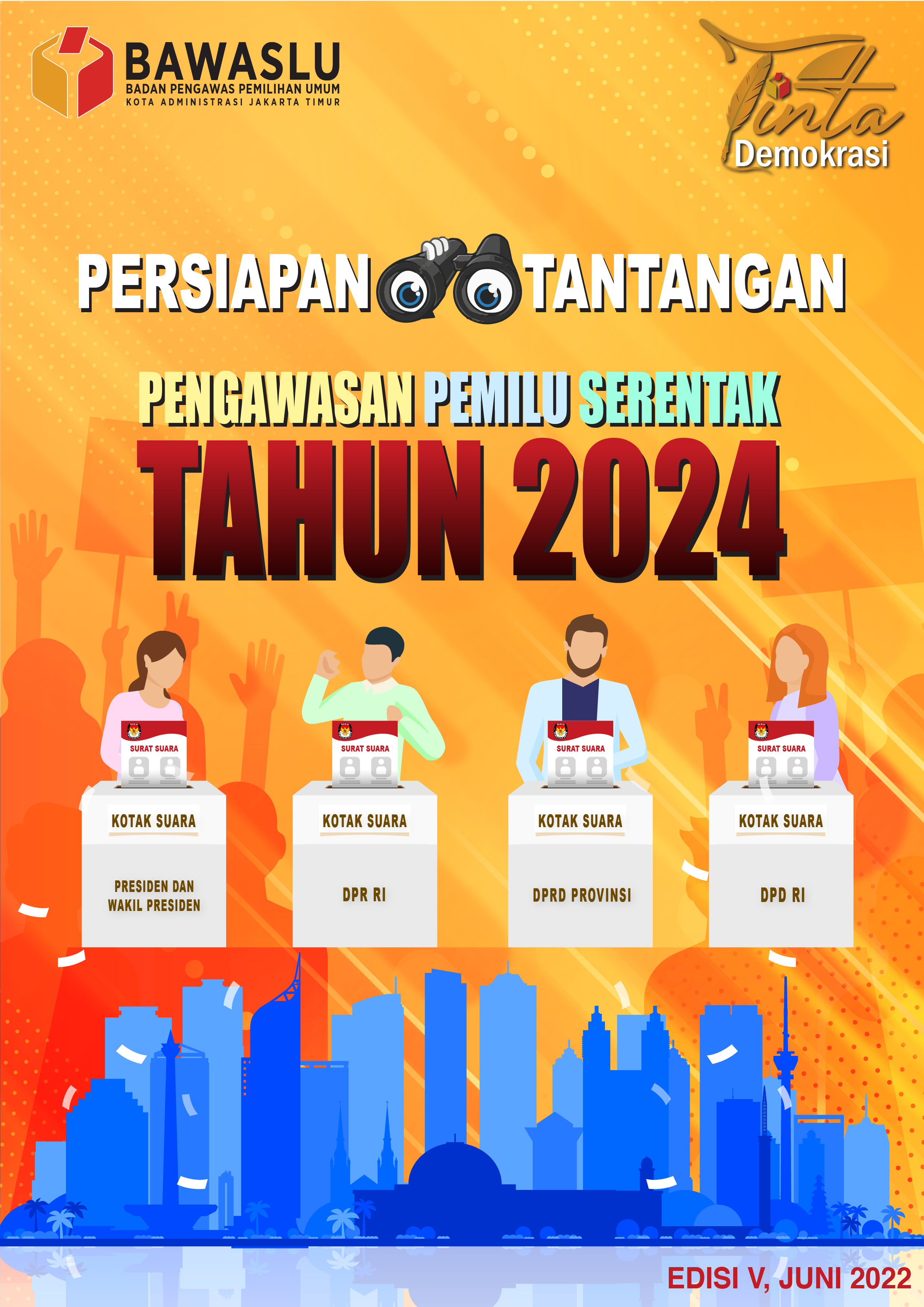 Alhamdulillah, puji syukur kepada Allah SWT yang telah memberikan nikmat sehat kepada kita semua, sehingga kami Tim Redaksi dapat menyelesaikan bulletin edisi ke-5 dengan mengambil tema “Tantangan dan Persiapan Pemilu Serentak Tahun 2024”. Tema tersebut kami ambil mengingat tahapan pelaksanaan pemilu serentak tahun 2024 akan dimulai pada tanggal 14 Juni 2022. Maka melalui bulletin ini, kami ingin memberikan gambaran kepada masyarakat luas seputar persiapan tahapan dan mitigasi pelaksanaan tahapan yang dilakukan oleh Bawaslu Kota Jakarta Timur dalam menghadapi pemilu serentak tahun 2024.
