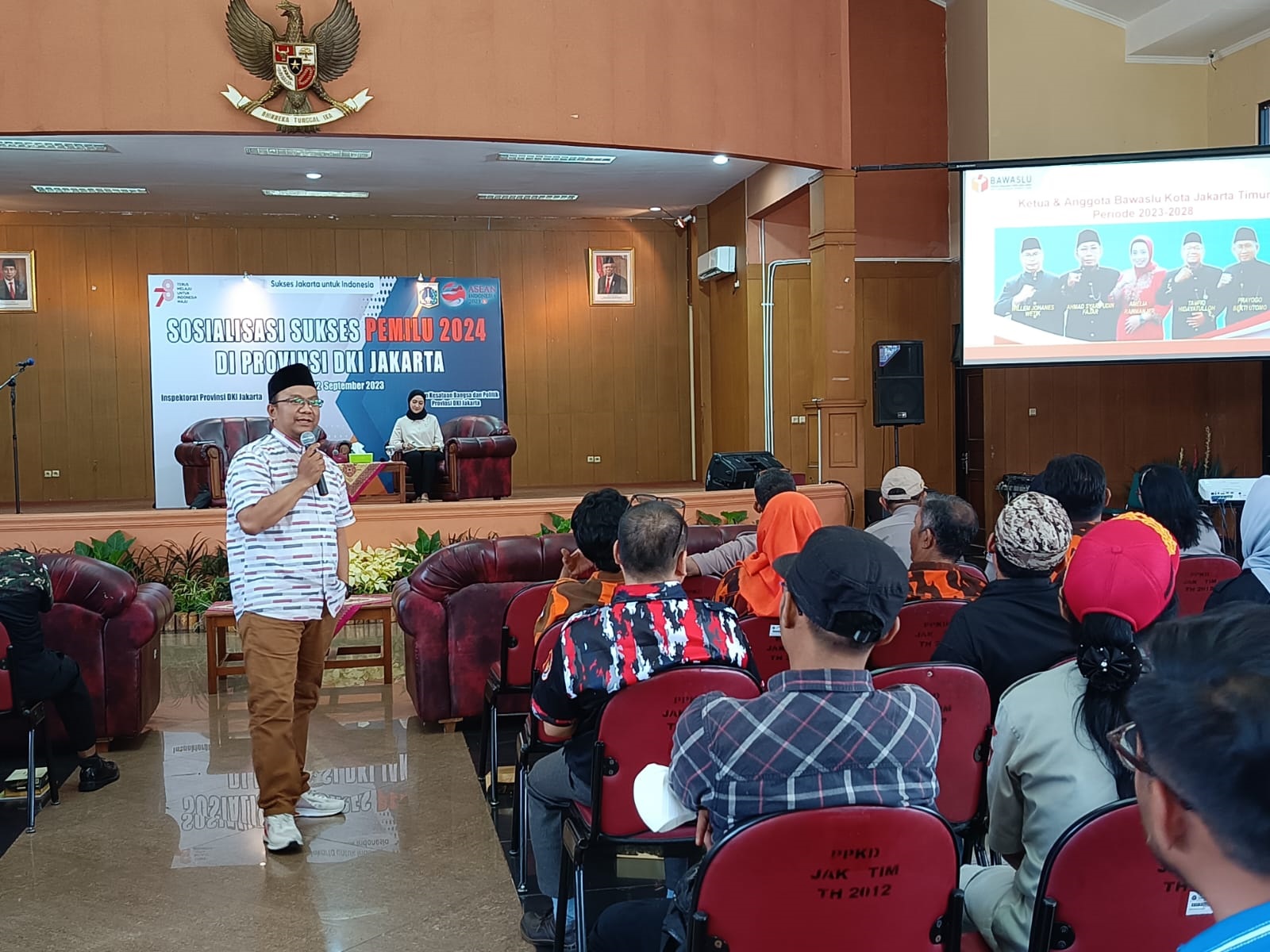 Jakarta, Bawaslu Jakarta Timur - Koordinator Divisi Pencegahan, Partisipasi Masyarakat dan Humas Bawaslu Kota Jakarta Timur, Taufik Hidayatulloh hadir sebagai Narasumber dalam kegiatan Sosialisasi Sukses Pemilu 2024 Di Provinsi DKI Jakarta yang diselenggarakan oleh Suku Badan Kesbangpol Jakarta Timur pada Selasa (12/09/2023).