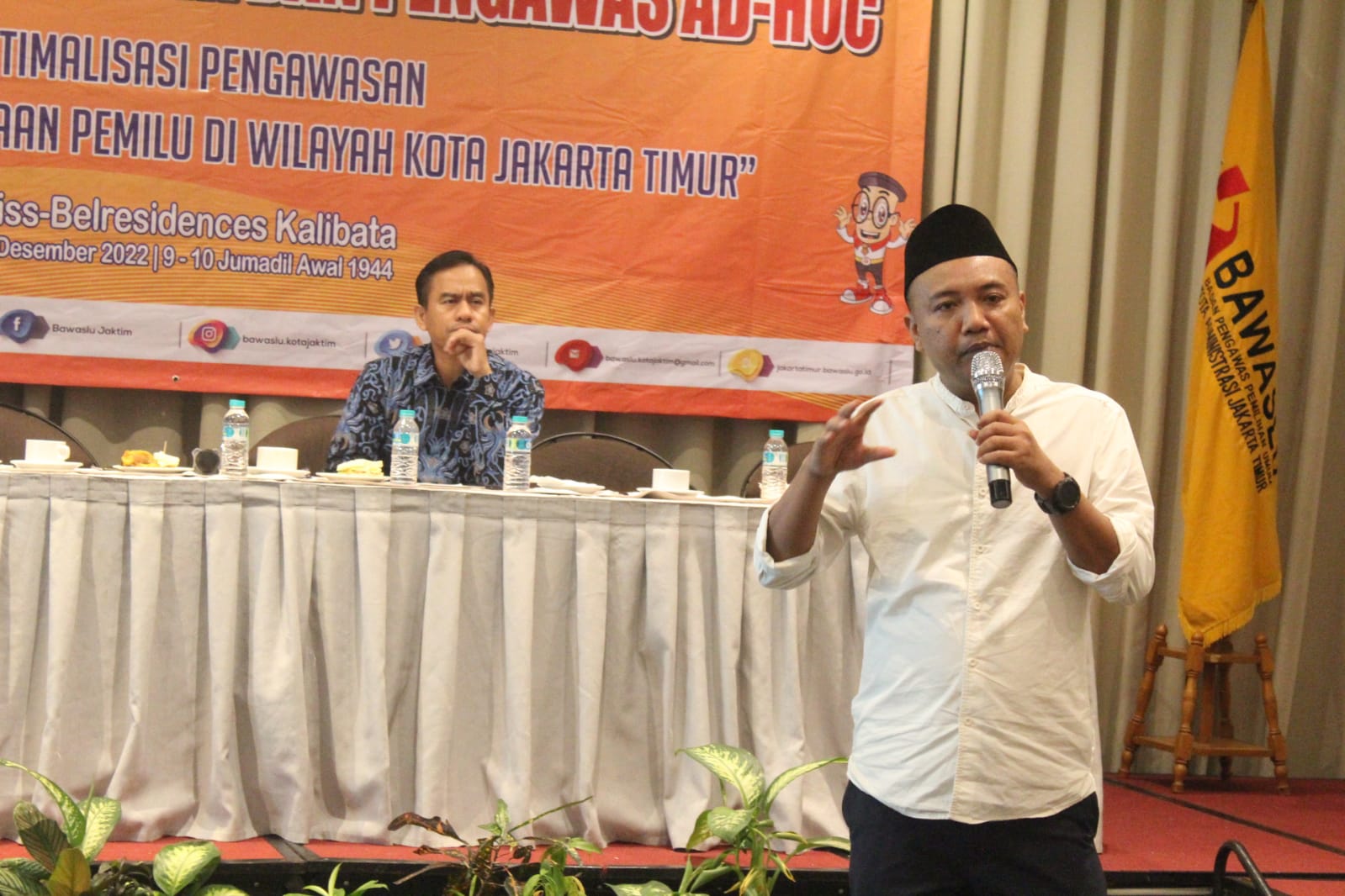 Peserta dalam agenda ini diantaranya adalah ketua Panwaslu kecamatan se-Jakarta Timur dan dari unsur perguruan tinggi. Dalam sambutan pembukaan, Bapak Sakhroji selaku ketua Bawaslu Kota Jakarta Timur menyampaikan bahwa terjadi penyempitan durasi tahapan pelaksanaan pemilu, khususnya pelaksanaan tahapan kampanye yang akan dilaksanakan pada bulan November tahun 2023. Hal tersebut berpotensi adanya kekosongan hukum khususnya berkaitan dengan kegiatan sosialisasi yang dilakukan partai politik yang telah di tetapkan sebagai peserta pemilu tahun 2024 dari Desember-Oktober 2023. Belum lagi perkembangan media kampanye yang terus berkembang, khususnya pemanfaatan media sosial yang perlu untuk diaawasi. Kemudian ditengah dinamika tahapan pengawasan pemilu, Anggota Bawaslu DKI Jakarta Ibu Siti Rakhman menyampaikan bahwa sebagai pengawas pemilu kita harus meninggalkan latar belakang kita untuk menjalankan tugas pengawasan tahapan secara netral dan terlihat netral.
