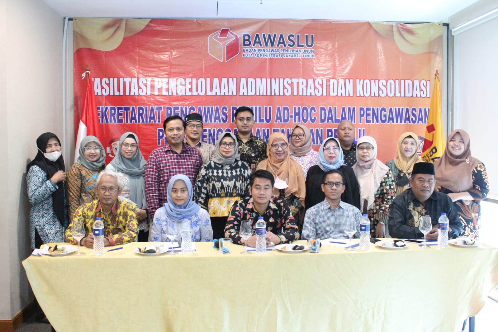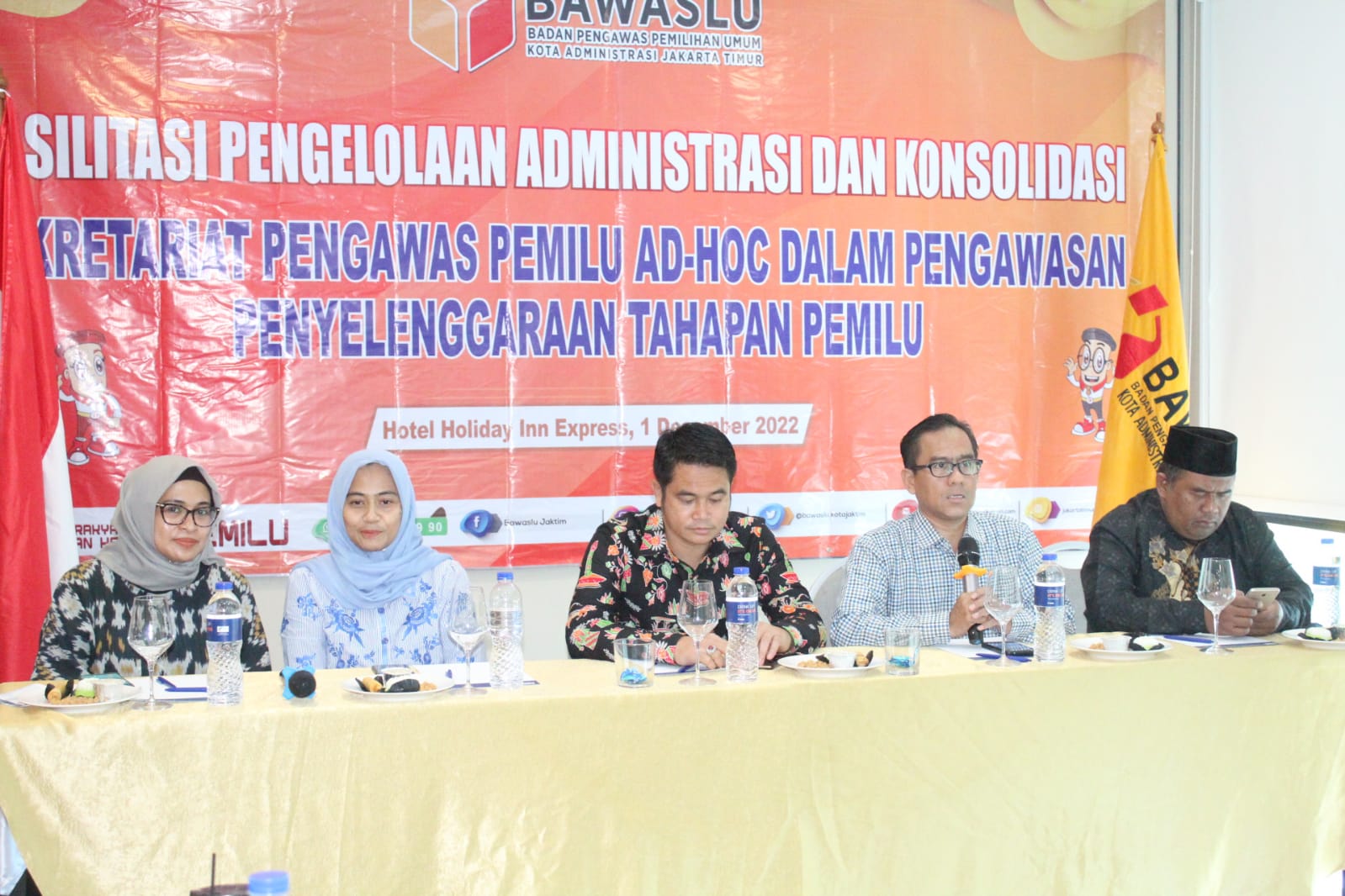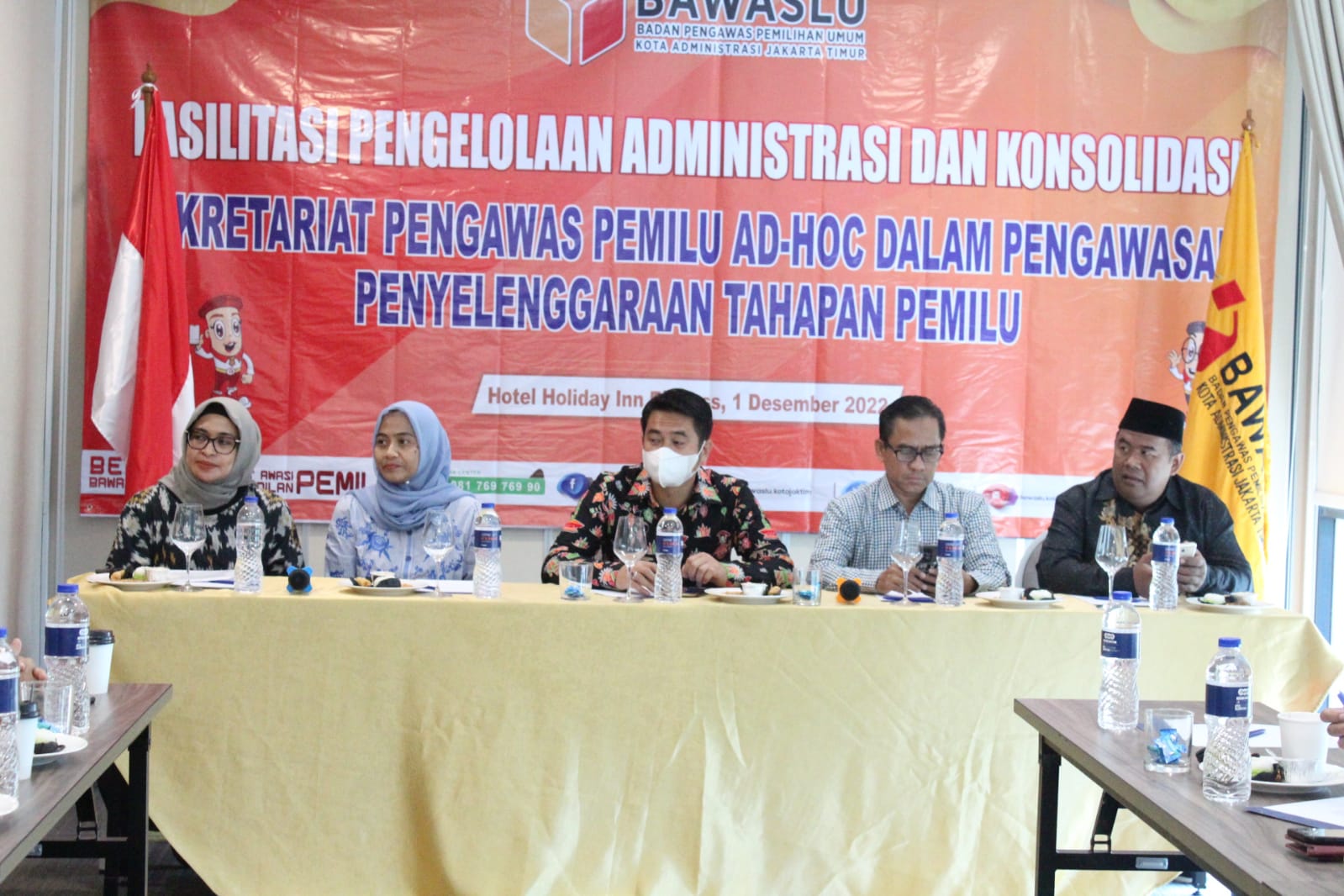 Jakarta, Bawaslu Jakarta Timur - Menggelar acara Rapat Fasilitasi Pengelolaan Administrasi dan Konsolidasi Sekretariat Pengawas Pemilu Ad-Hoc dalam penyelenggaraan tahapan Pemilu tahun 2024 dengan tema Konsolidasi Persiapan Pembentukan Pengawas Ad-hoc Kelurahan di Wilayah Jakarta Timur. Kegiatan ini dibuka langsung oleh Pimpinan Bawaslu Provinsi DKI Jakarta.