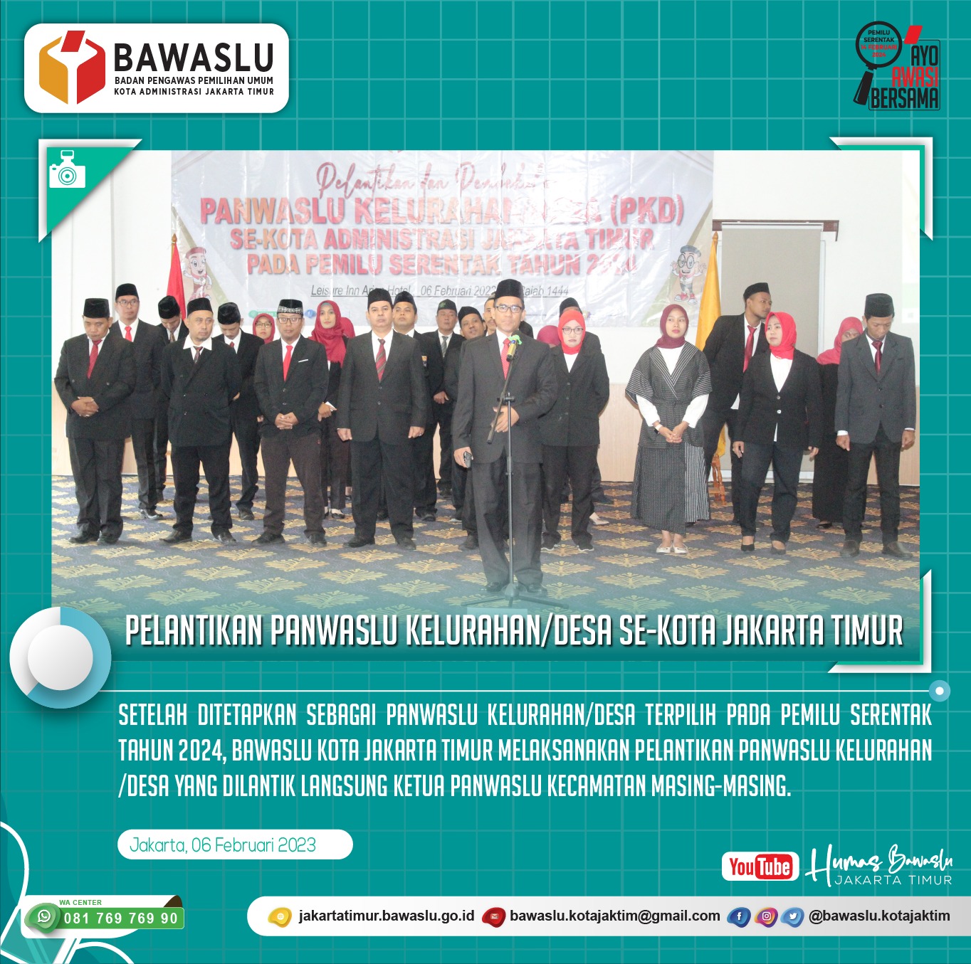 Jakarta, Bawaslu Jakarta Timur - Panwaslu Kecamatan se-Jakarta Timur melantik 65 Panwaslu Kelurahan/Desa se-Jakarta Timur secara serentak yang difasilitasi oleh Bawaslu Kota Jakarta Timur pada tanggal 6 Ferbruari 2023.