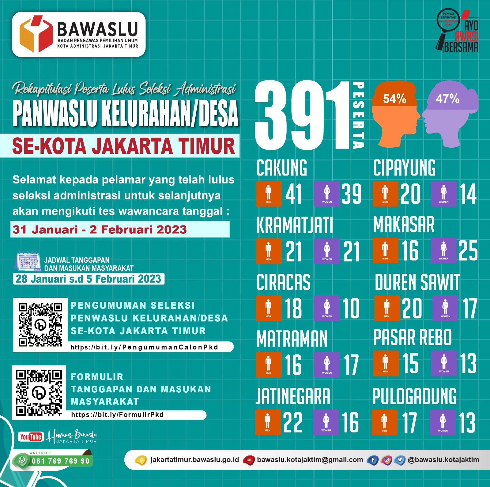 Pengumuman Hasil Seleksi Administrasi Calon Panwaslu Kelurahan/Desa se-Kecamatan di Wilayah Jakarta Timur: Sebanyak 391 Pelamar Lolos Seleksi Administrasi