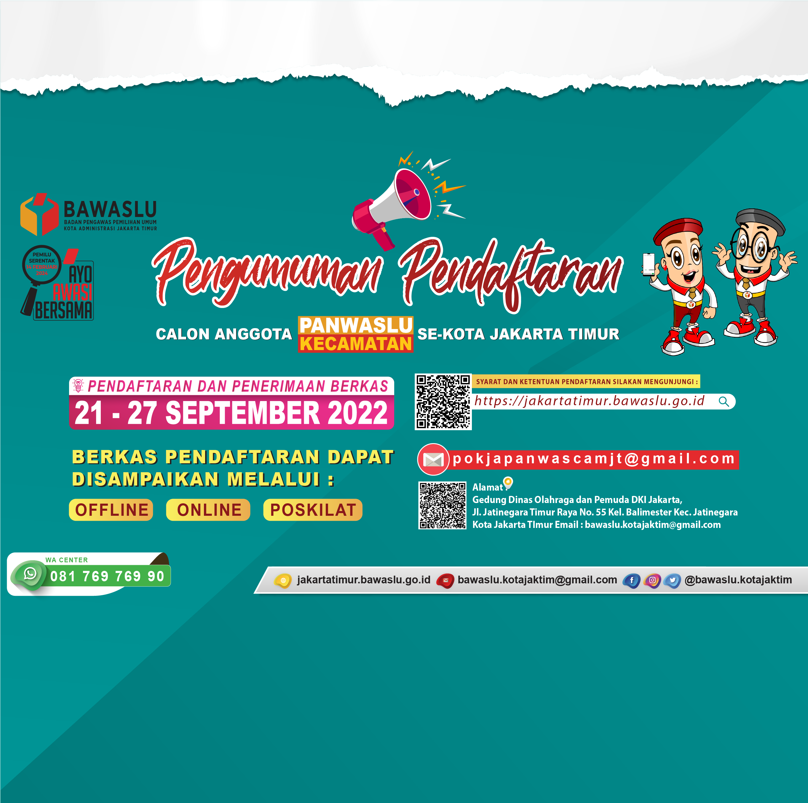 - Formulir berkas administrasi calon anggota Panwaslu Kecamatan dan keterangan lebih lanjut dapat diperoleh di laman Bawaslu Kabupaten/Kota atau Bawaslu Provinsi, media sosial, atau sekretariat Bawaslu Kota Jakarta Timur;