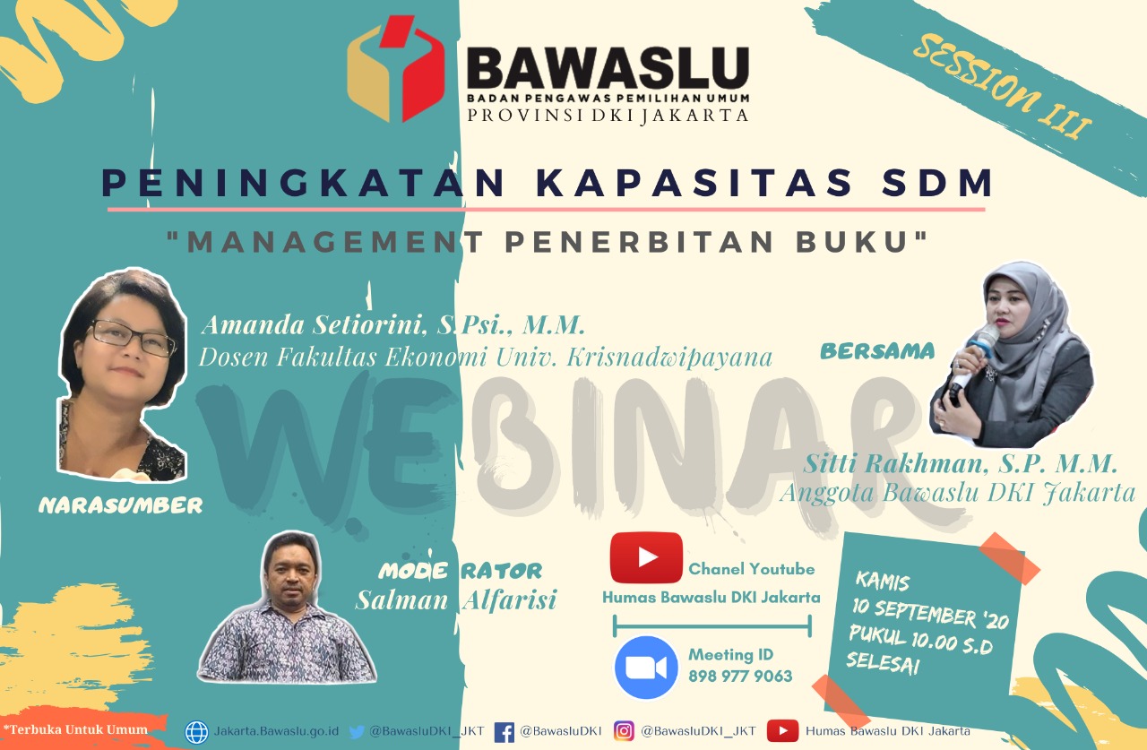 Jakarta, Bawaslu Jakarta Timur – Bawaslu Provinsi DKI Jakarta menyelenggarakan kegiatan Webinar Peningkatan Kapasitas SDM sesi Ke-3 dengan tema “Management Penerbitan Buku” secara Daring dan disiarkan langsung melalui akun Youtube Humas Bawaslu Provinsi DKI Jakarta pada hari Kamis (10/09/2020).