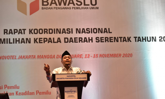 Jakarta, Badan Pengawas Pemilihan Umum - Bawaslu menggelar Rapat Koordinasi Nasional (Rakornas) Pengawasan Pemilihan Kepala Daerah Serentak Tahun 2020 yang terbagi menjadi tiga gelombang dan diikuti secara virtual maupun tatap muka dimulai sejak 13- 15 November 2020 di Jakarta. Dalam kesempatan itu, Koordinator Divisi Pengawasan dan Sosialisasi Mochammad Afifuddin menyebutkan tiga program unggulan divisi pengawasan Bawaslu.