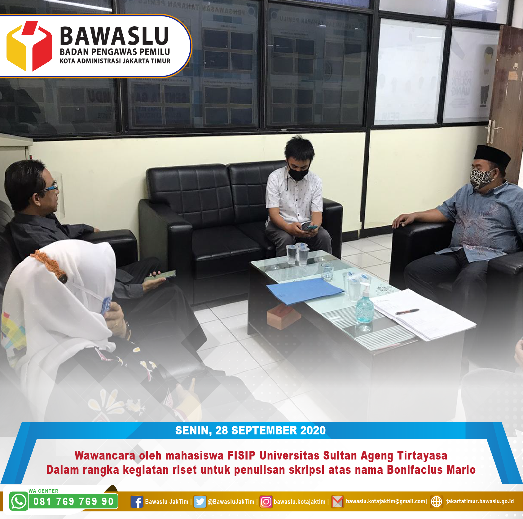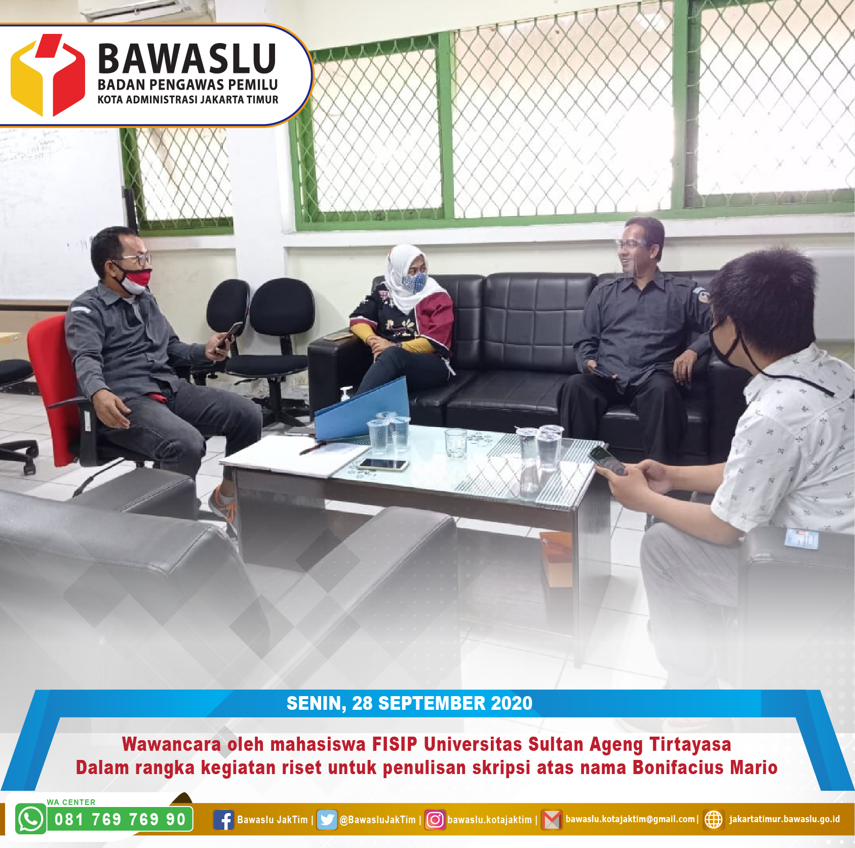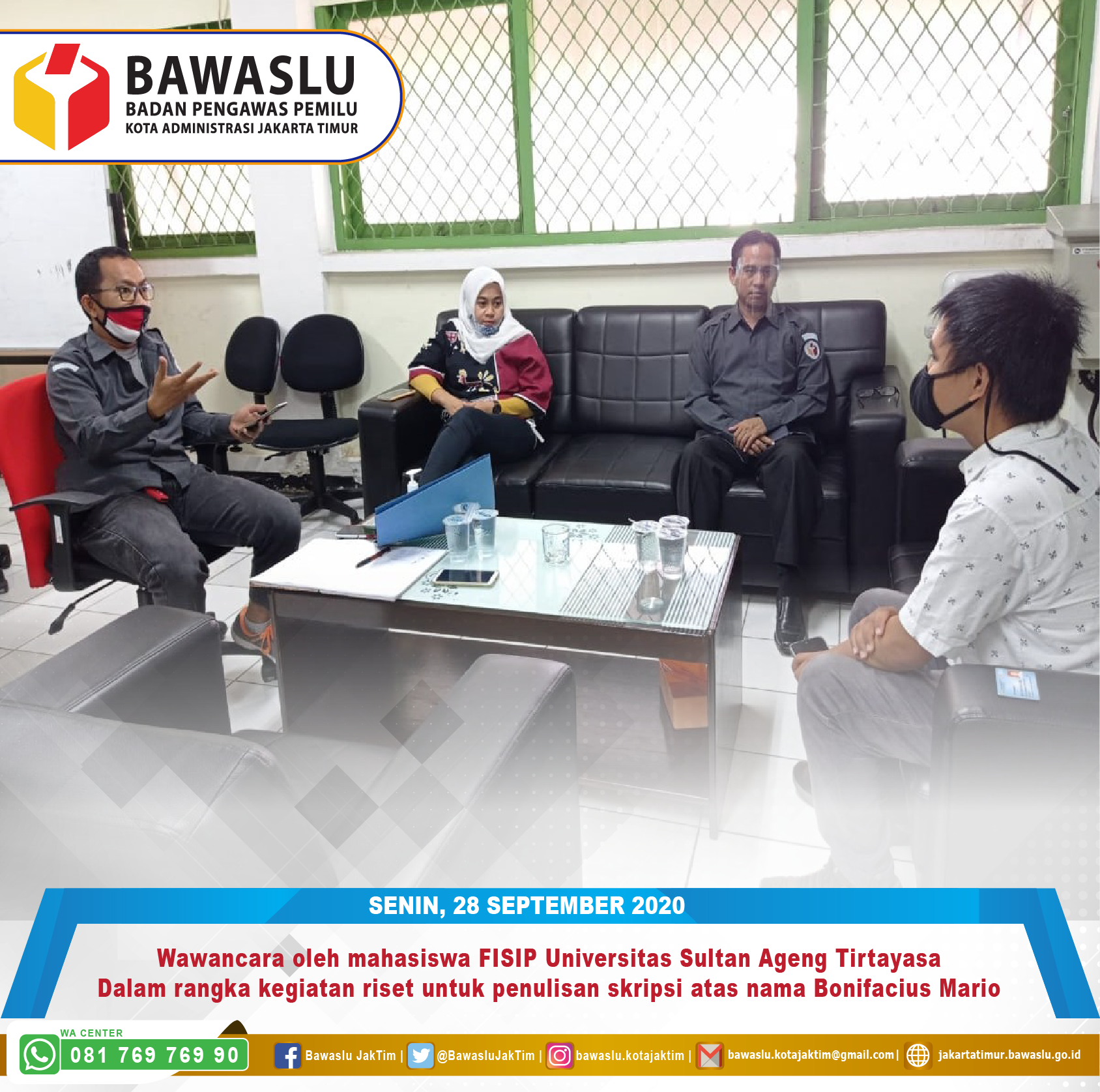 Wawancara oleh mahasiswa FISIP Universitas Sultan Ageng Tirtayasa dalam rangka kegiatan riset untuk penulisan skripsi atas nama Bonifacius Mario (28/9) humas | Senin, September 28, 2020 - 15:47 Tag Galeri Foto Share Berita Terkini humas Kamis, April 16, 2026 - 11:22 Bawaslu Jakarta Timur Gelar Klinik Pemilu Edisi II, Bahas Tindak Lanjut Hasil Pengawasan humas Kamis, April 16, 2026 - 08:52 Bawaslu Jakarta Timur Hadiri FGD Penataan Daerah Pemilihan di KPU Kota Jakarta Timur humas Rabu, April 15, 2026 - 15:48 Konsolidasi Demokrasi Partai Ummat Jakarta Timur Soroti Pengawasan dan Kualitas Data Pemilih Lihat Lainnya