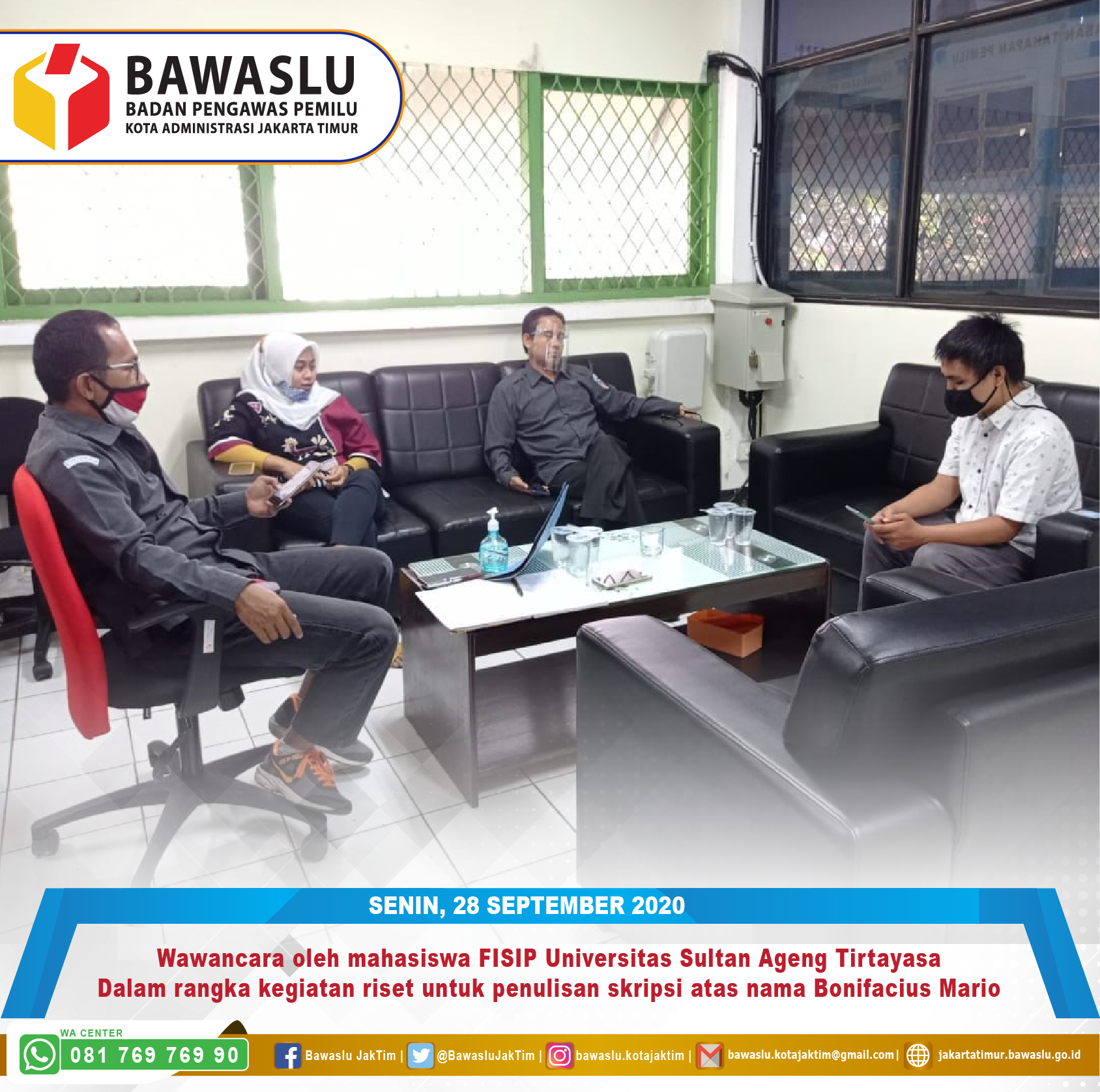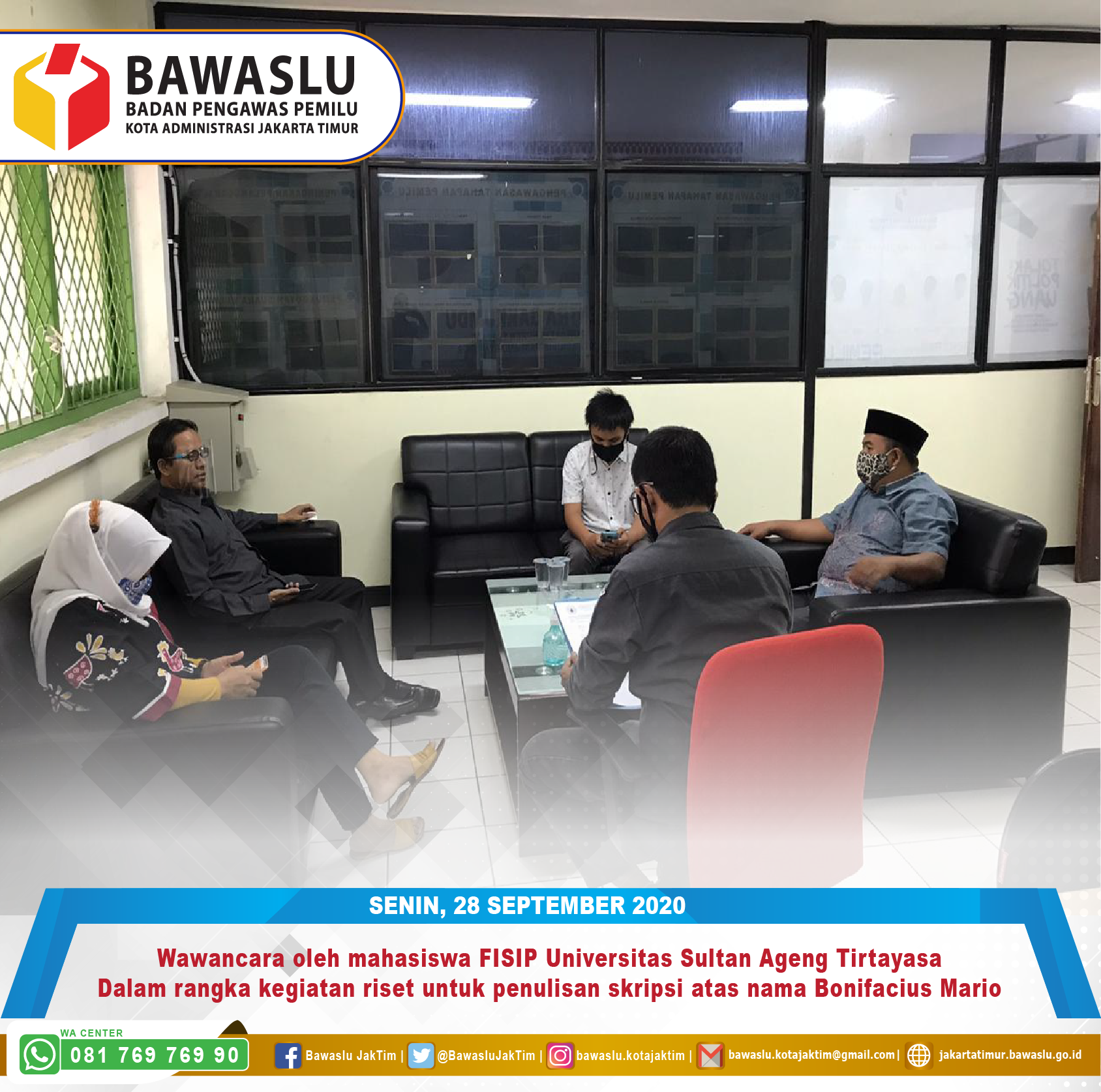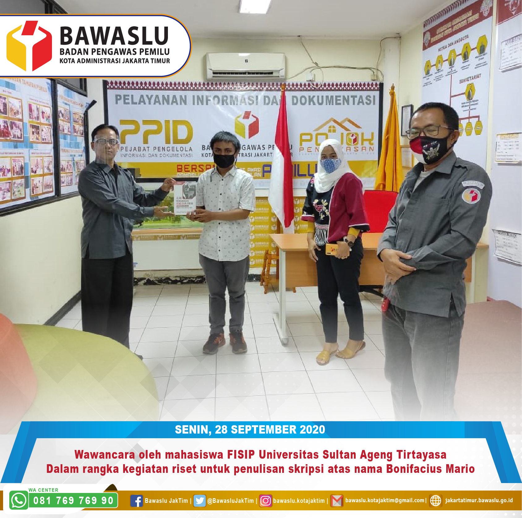 Wawancara oleh mahasiswa FISIP Universitas Sultan Ageng Tirtayasa dalam rangka kegiatan riset untuk penulisan skripsi atas nama Bonifacius Mario (28/9) humas | Senin, September 28, 2020 - 15:47 Tag Galeri Foto Share Berita Terkini humas Kamis, April 16, 2026 - 11:22 Bawaslu Jakarta Timur Gelar Klinik Pemilu Edisi II, Bahas Tindak Lanjut Hasil Pengawasan humas Kamis, April 16, 2026 - 08:52 Bawaslu Jakarta Timur Hadiri FGD Penataan Daerah Pemilihan di KPU Kota Jakarta Timur humas Rabu, April 15, 2026 - 15:48 Konsolidasi Demokrasi Partai Ummat Jakarta Timur Soroti Pengawasan dan Kualitas Data Pemilih Lihat Lainnya
