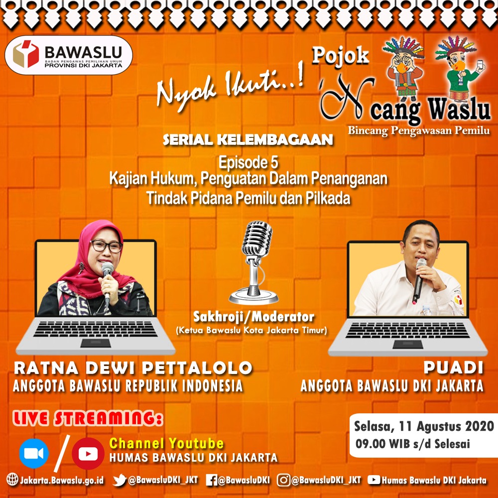 Jakarta, Bawaslu Jakarta Timur - Bawaslu Provinsi DKI Jakarta menggelar kegiatan rutin yang dilakukan setiap hari Selasa, Diskusi Pojok Ncang Waslu (Bincang Pengawas Pemilu) yang dilaksanakan pukul 09.00 WIB - selesai. Program ini merupakan kerjasama antara Divisi Penanganan Pelanggaran dengan Divisi HuMas dan Hubungan Antar Lembaga Bawaslu Provinsi DKI Jakarta.